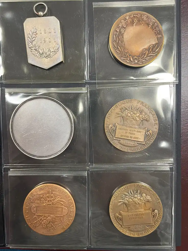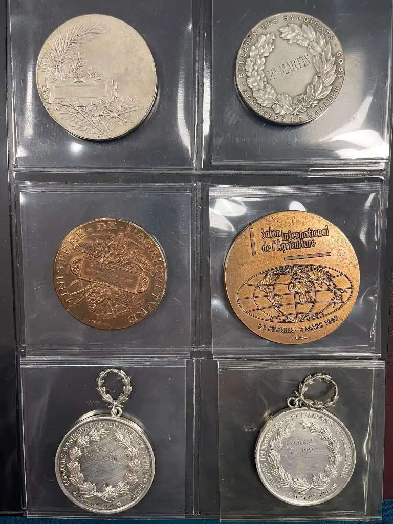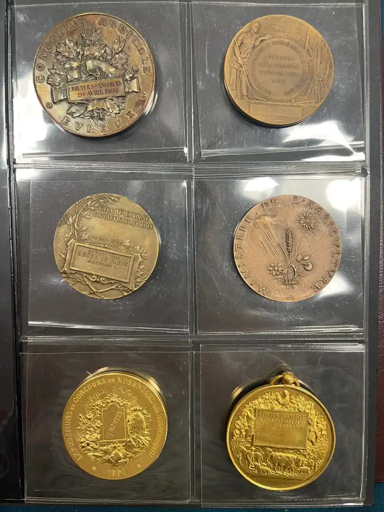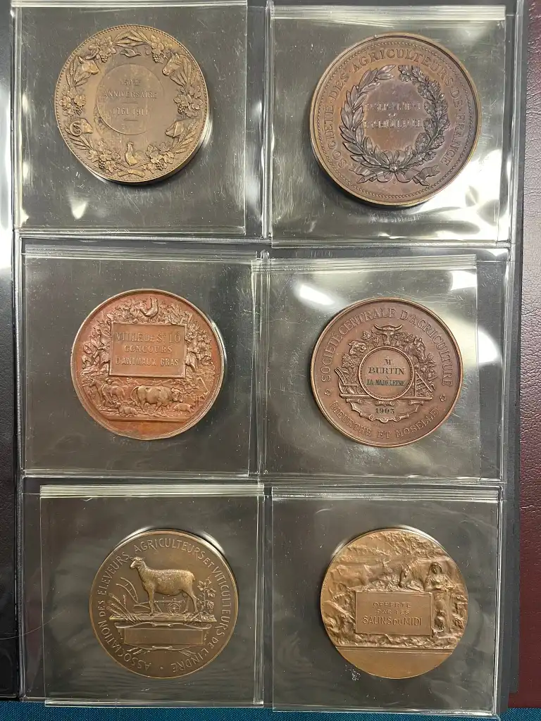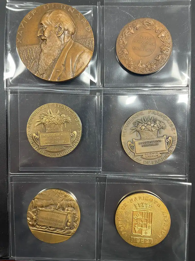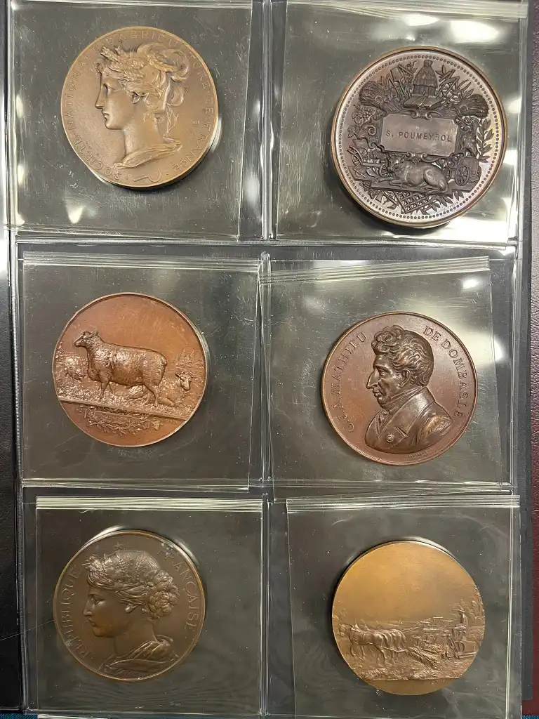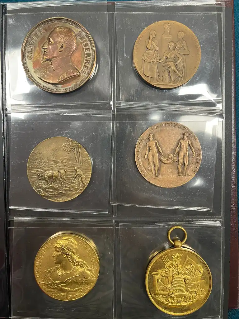 Album de 30 médailles agricoles en bronze, bronze doré, bronze argenté et cuivre comprenant notamment : - République Française. Exposition et concours de Rosendael les Dunkerque de 1891.