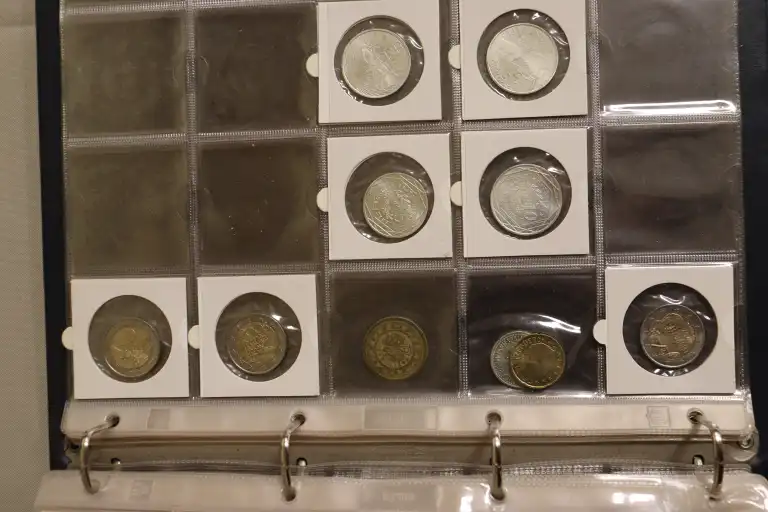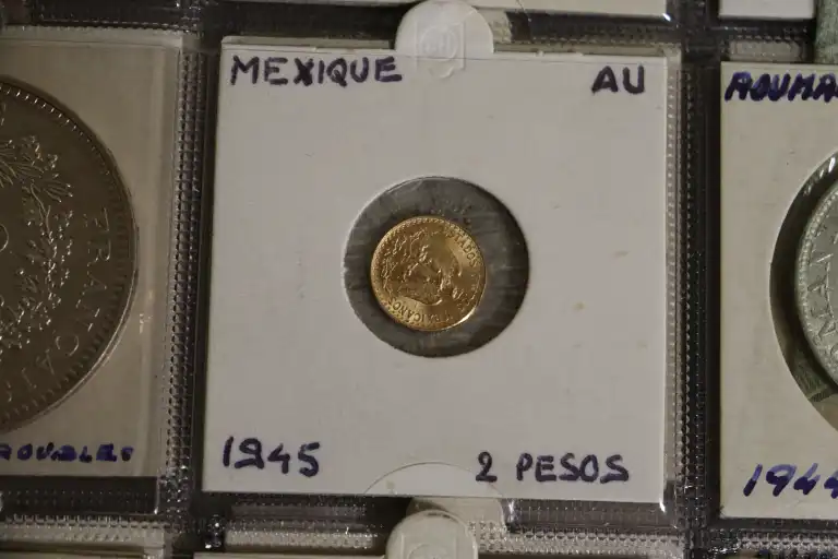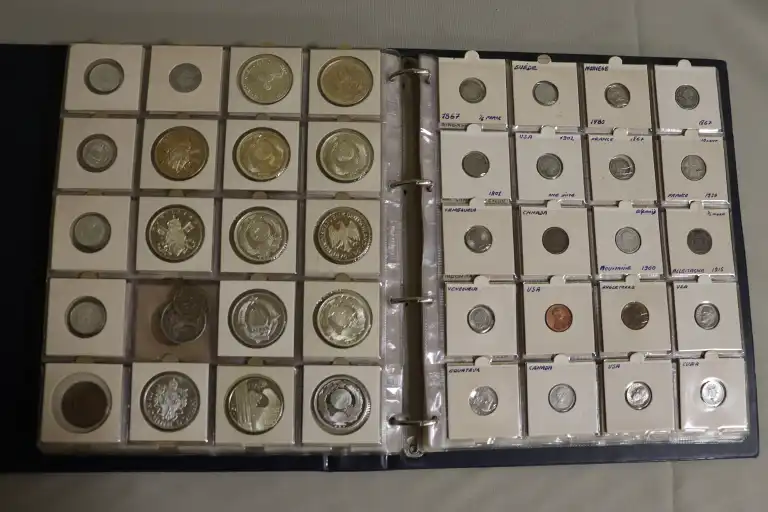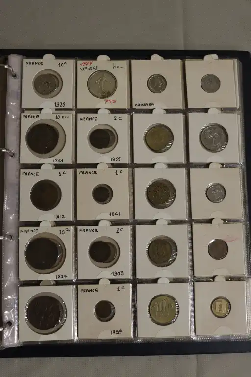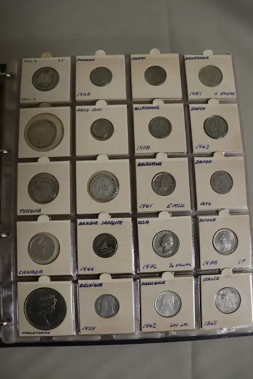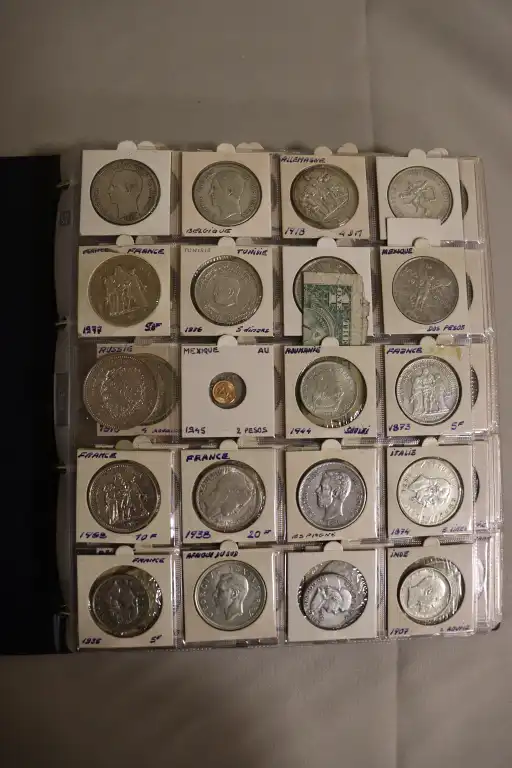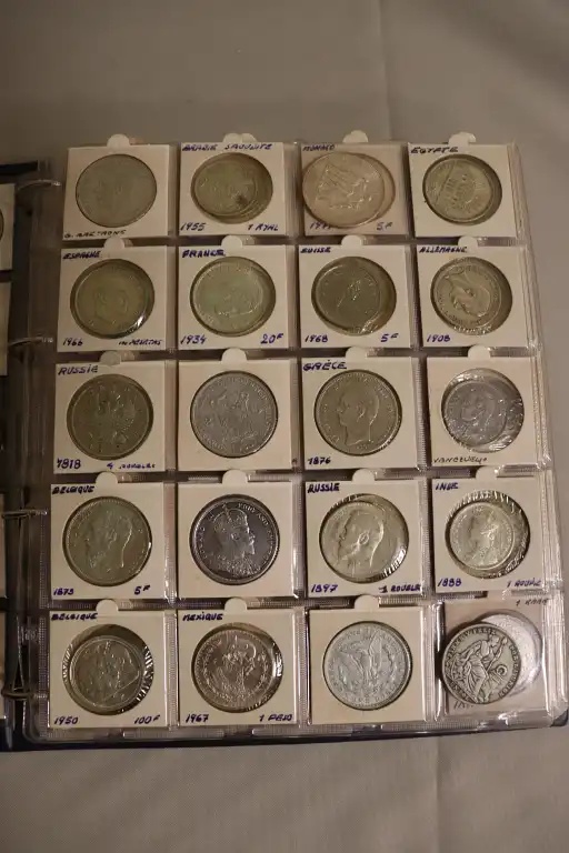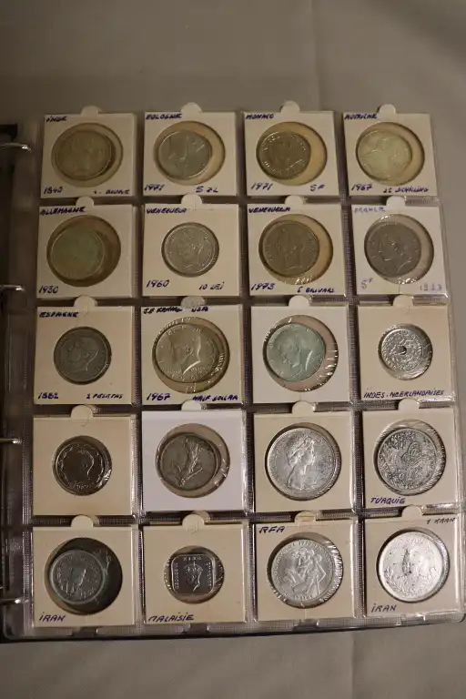 Album de 17 Pages contenant plus de 300 monnaies du monde et Françaises dont, 1 Billet de 1 Dollar, des dizaines de d'écus et monnaies en argent notamment et (1) 2 Pesos en or