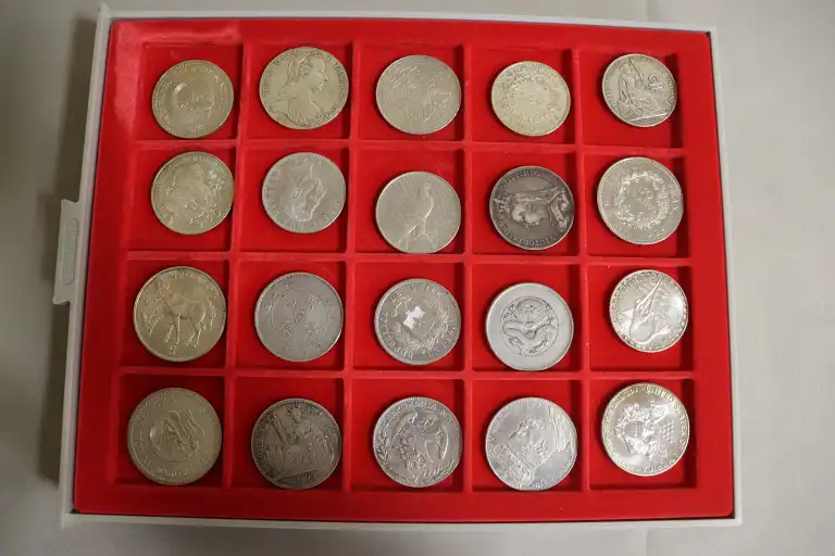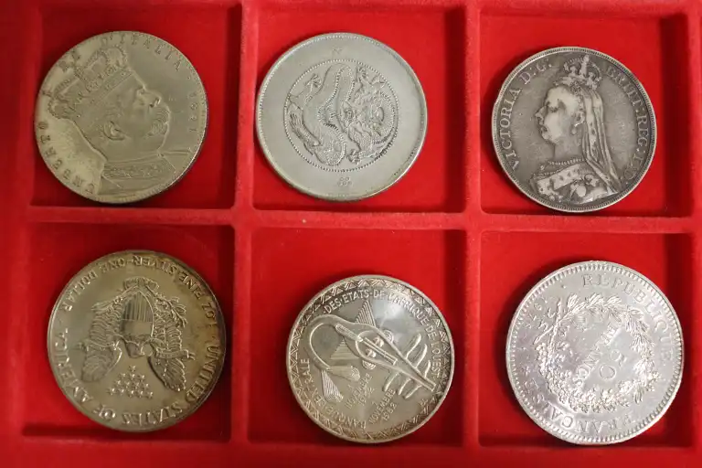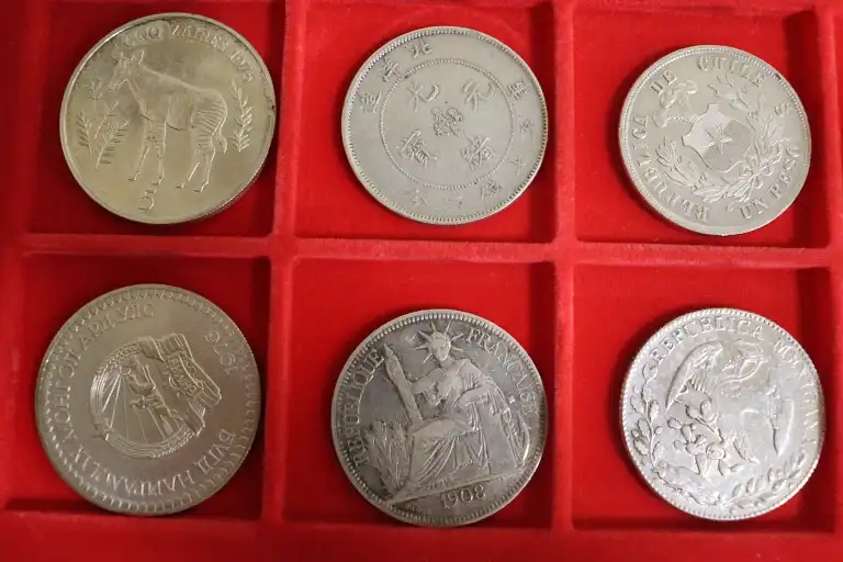Lot de 20 pièces en argent de pays divers dont FRANCE, CHILI, CHINE, ETATS UNIS, ETATS DE L'AFRIQUE DE L'OUEST... Poids total : 558 g