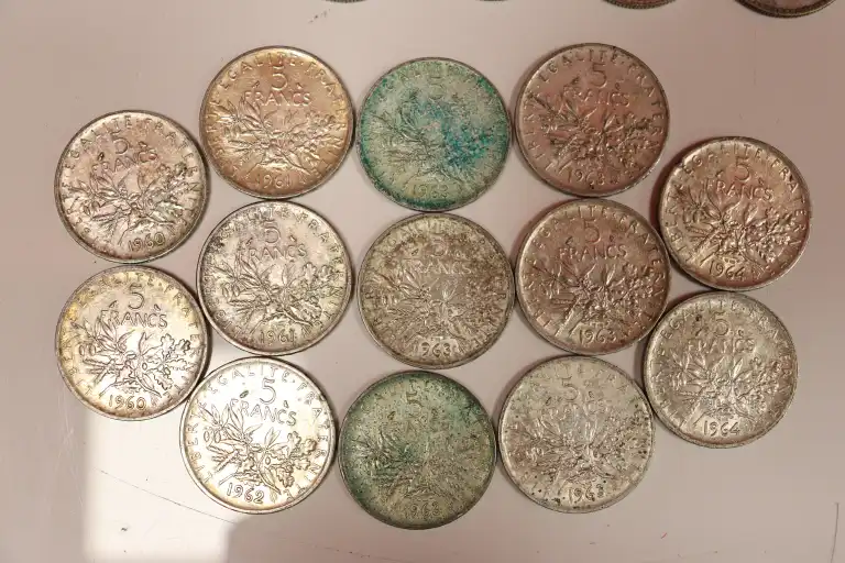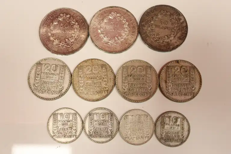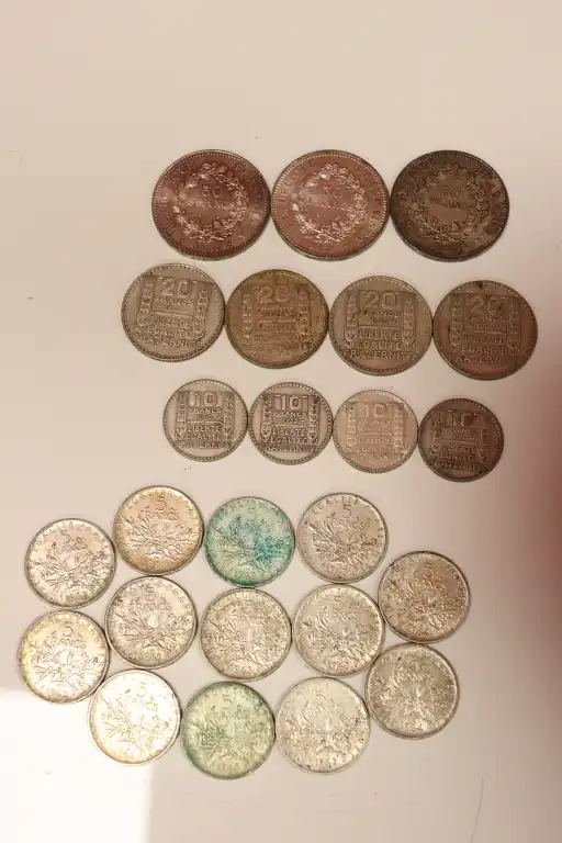 Lot de pièces en argent comprenant : 3 pièces de 50 Fr HERCULE (1974, 1975, 1977), 4 pièces de 20 Fr TURIN (1929 x2, 1933, 1938), 4 pièces de 10 Fr TURIN (1930 x2, 1931, 1933), 13 pièces de 5 Fr SEMEUSE (1960 x2, 1961 x2, 1962, 1963 x6, 1964 x2)