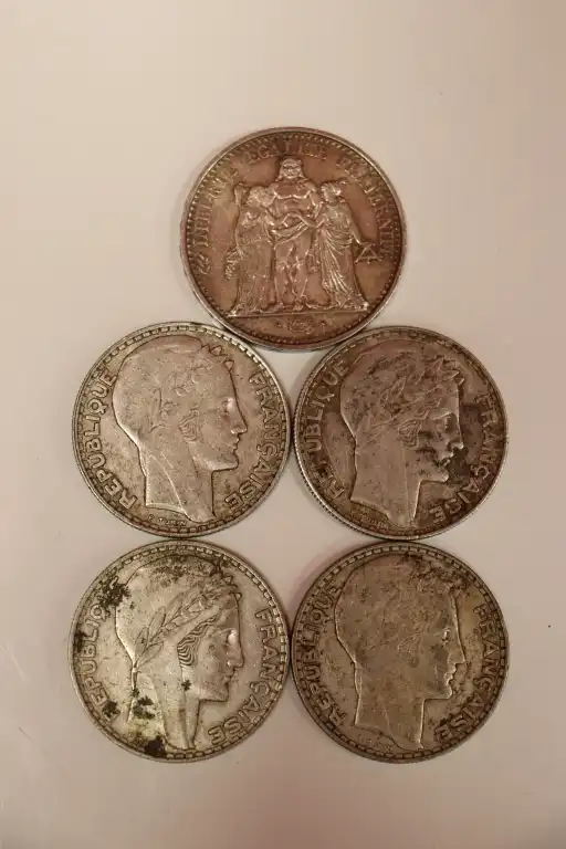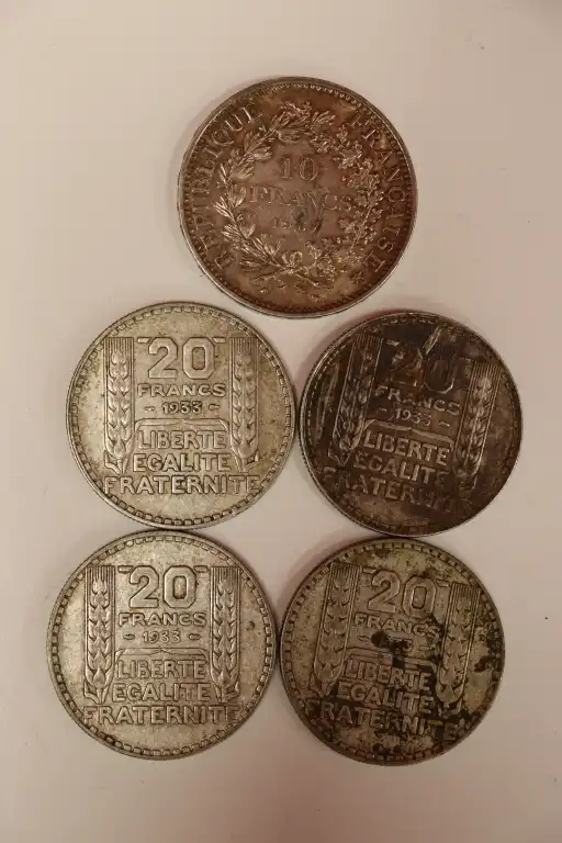 Lot de 5 pièces en argent : 1 pièce 10 Francs Hercule de 1967 et 4 pièces de 20 Francs Turin en argent de 1933. Poids : 106 g