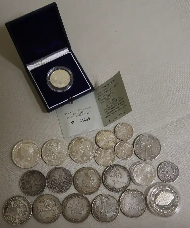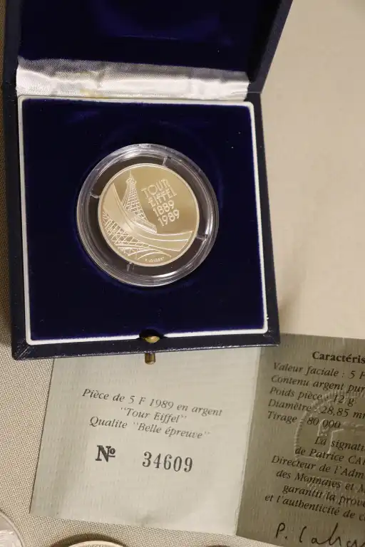 Lot de pièces en argent comprenant : - Monnaie de Paris. Pièce de 5 F 1989 "Tour Eiffel" Belle épreuve n°34609 (certificat et écrin),