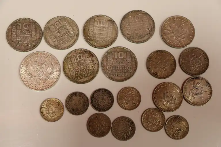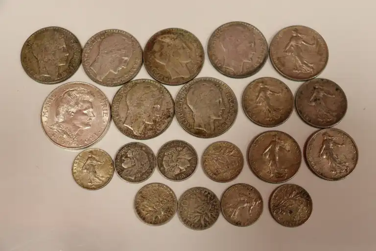 Lot de pièces en argent comprenant : 1 pièce de 100 Francs Marie Curie (1984), 6 pièces de 10 Francs Turin (1929, 1931, 1932 x2, 1934 x2), 1 pièce de 2 Francs (1916), 4 pièces de 1 Franc (1909, 1916 x2, 1917), 8 pièces de 50 Centimes (1895, 1901, 1907, 1916 x2, 1918, 1919, une illisible)