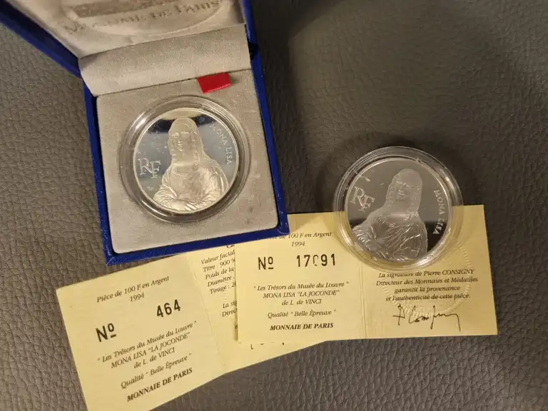 - Les Trésors du Musée du Louvre. LA JOCONDE, N°464 et N°17091 de 1994, 2 pièces de 100 Francs ;