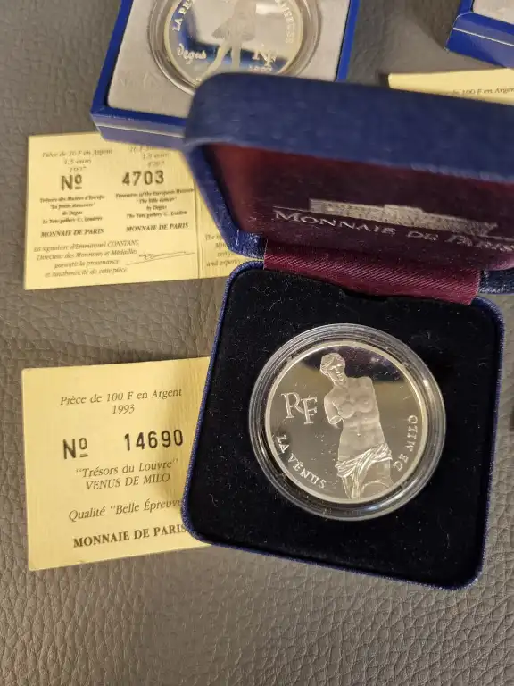 MONNAIE DE PARIS. Lot de 4 pièces en argent 900, avec certificats dont 3 dans leur écrin comprenant : - Trésors du Louvre. VENUS DE MILO, N°14690 de 1993, pièce de 100 Francs ;