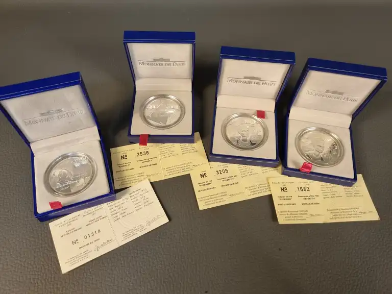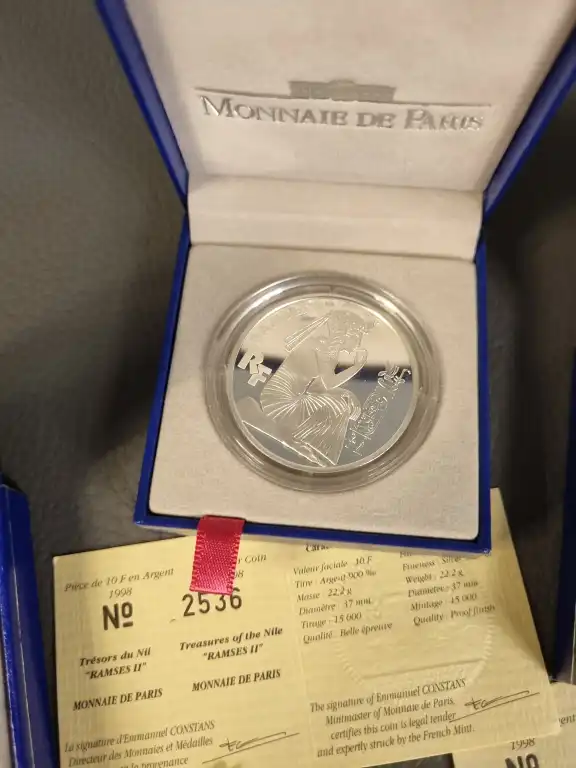 MONNAIE DE PARIS. Lot de 4 pièces en argent 900 avec certificat et écrin comprenant : - Trésors du Nil. RAMSES II, n°2536 de 1998, pièce de 10 Francs ;