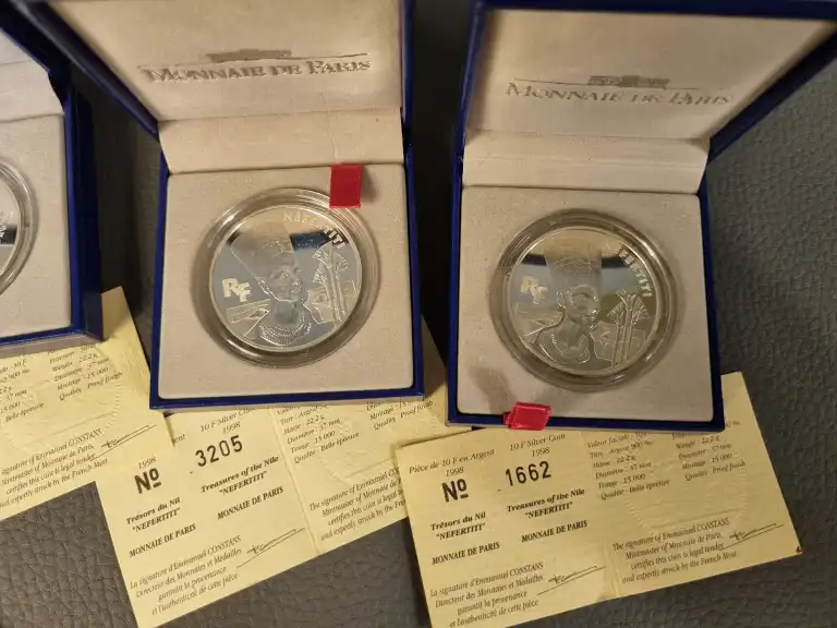 - Trésors du Nil. NEFERTITI, n°1662 et 3205 de 1998, 2 pièces de 10 Francs ;