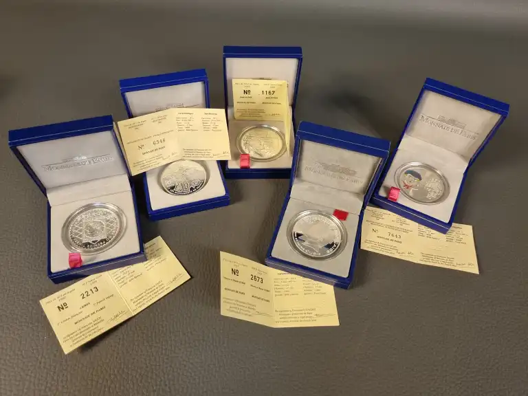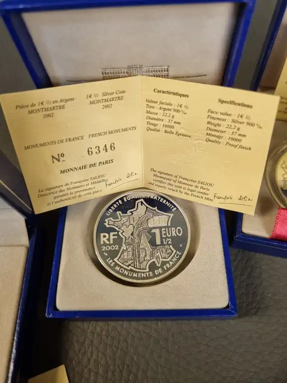 MONNAIE DE PARIS. Lot de 5 pièces en argent 900 avec certificat et écrin comprenant : - Monuments de France. MONTMARTRE, n°6346 de 2002, pièce de 1€ 1/2 ;