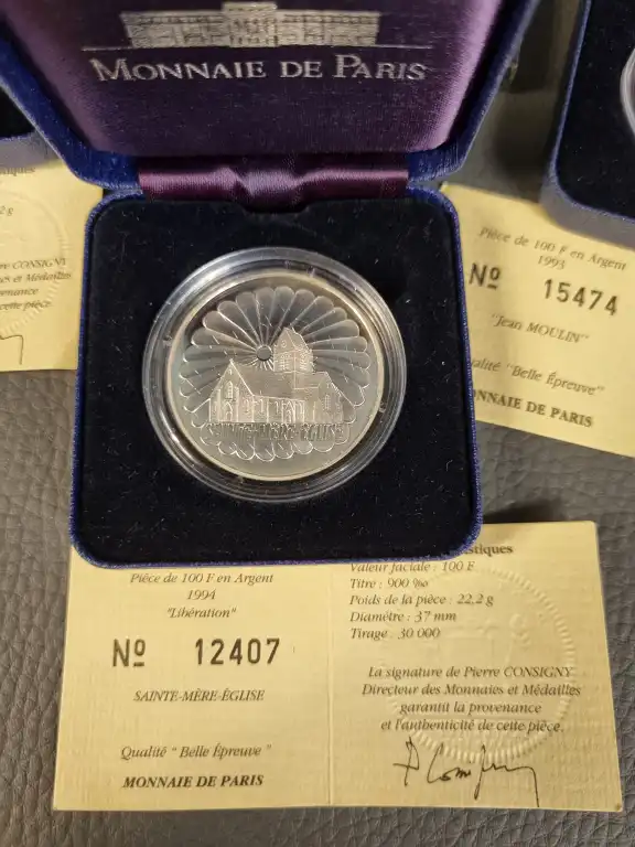 MONNAIE DE PARIS. Lot de 4 pièces en argent 900 avec certificat et écrins, comprenant : - Libération. SAINTE-MERE-EGLISE, n° 12407 de 1994, pièce de 100 Francs