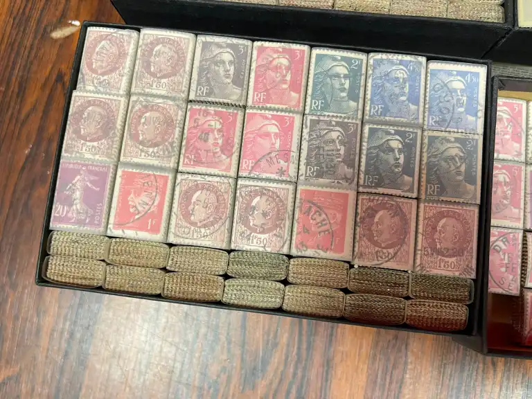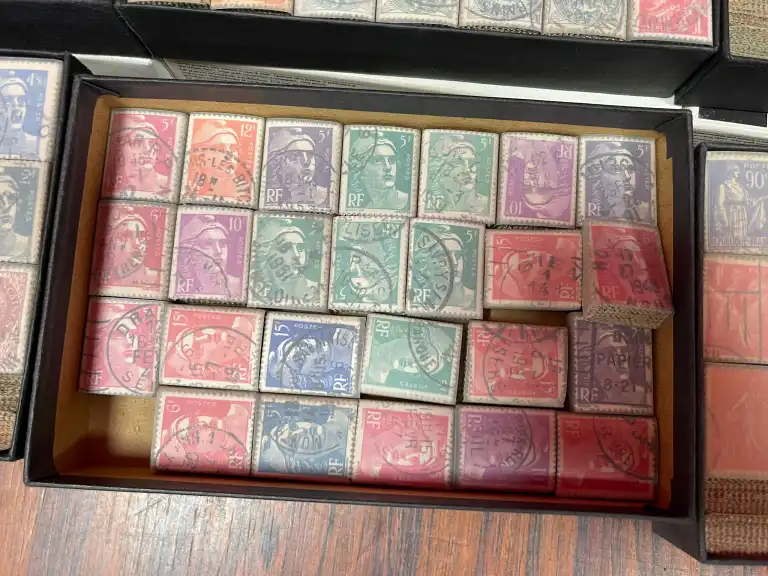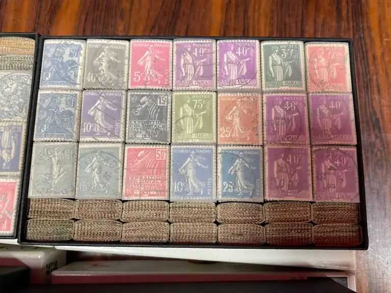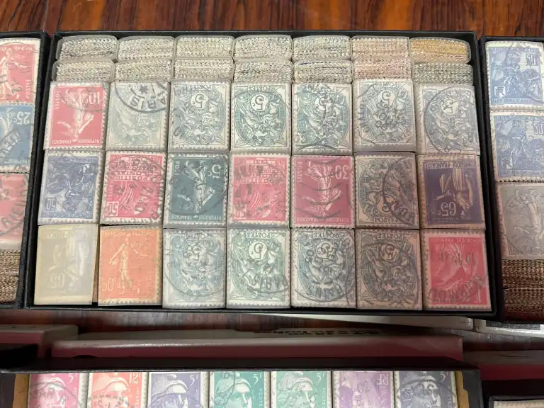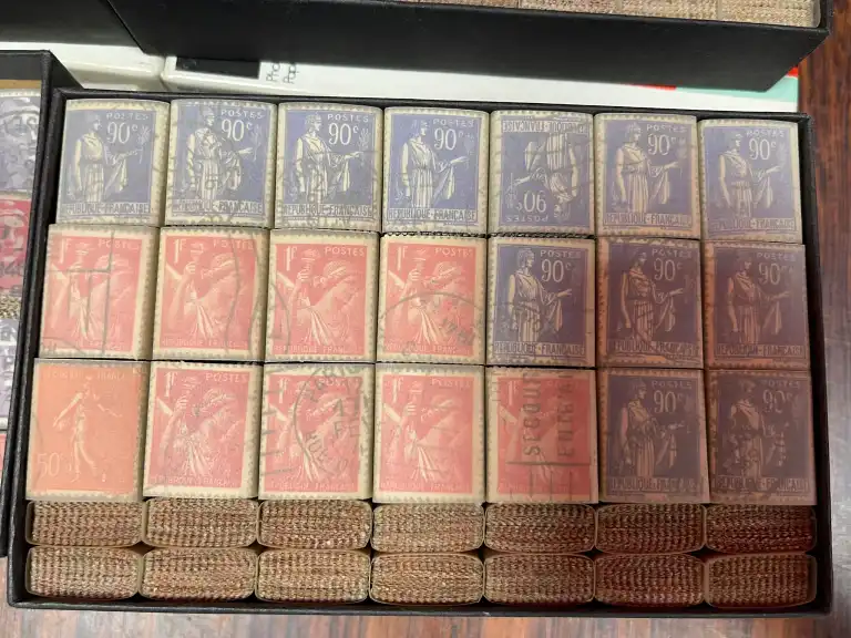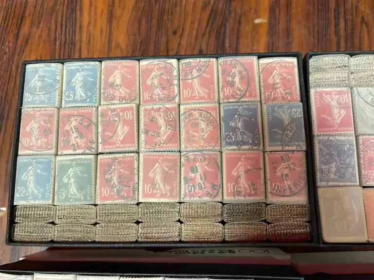 FRANCE Timbres d’usage courant en PAQUETS de 100. Type Blanc, Semeuse, Paix, Expo Coloniale, Jeanne D’Arc, Iris, Paix, Gandon, Pétain. Environ 35000 timbres pour l’étude des types et oblitérations.
