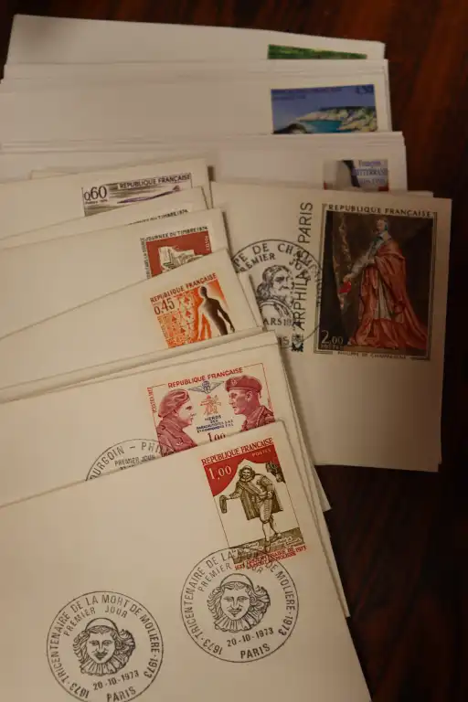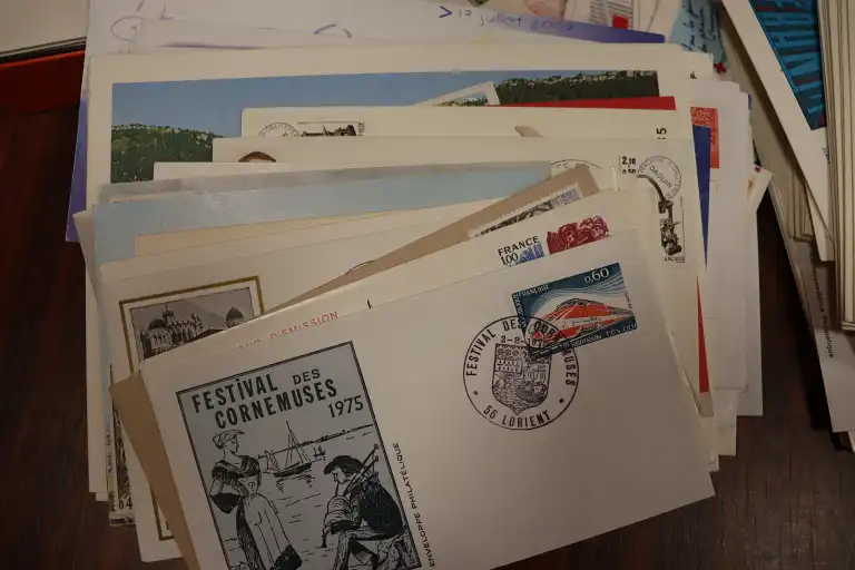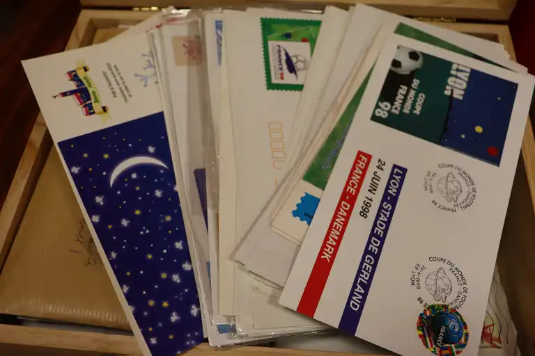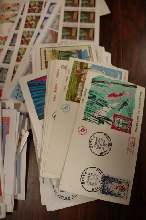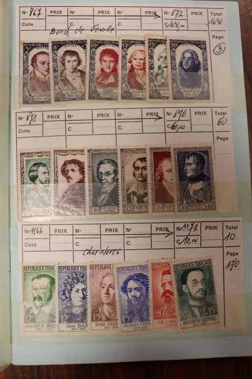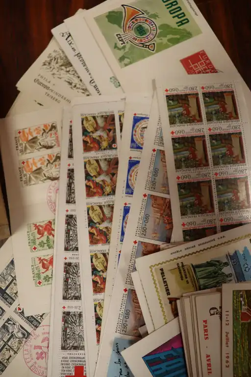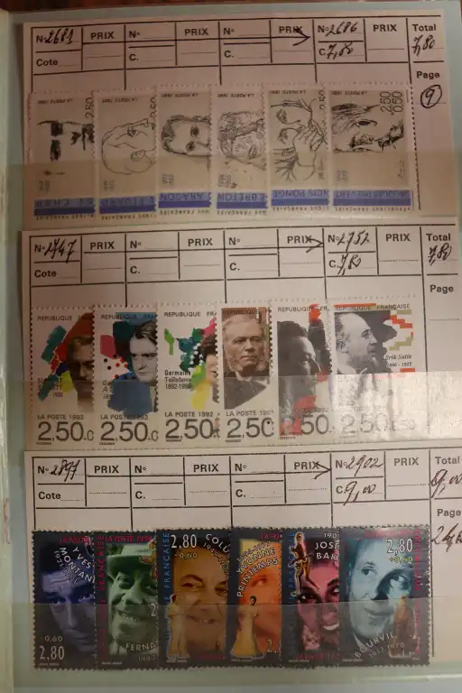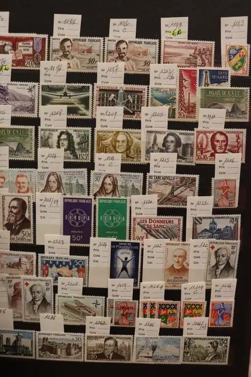 FRANCE. Petit stock de timbres neufs par multiples de 1900 à 1997 + Quelques timbres en Euro,carnets et 1er jours. Timbres avec charnières au début puis ** après. + CFA oblitérés et un boite en bois de lettres entiers et prêts a poster divers.